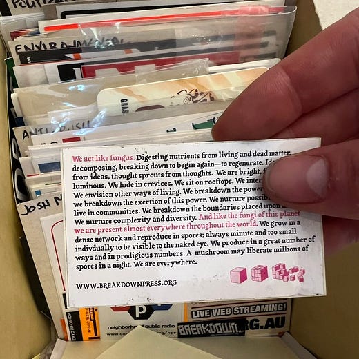 The archive is primarily focused on ephemera; it’s divided up into sets of boxes with labels like “stickers” and “media” along with sections for printed books and zines. It’s a blast to thumb through; I plan for a quick trip but we stay for almost two hours.